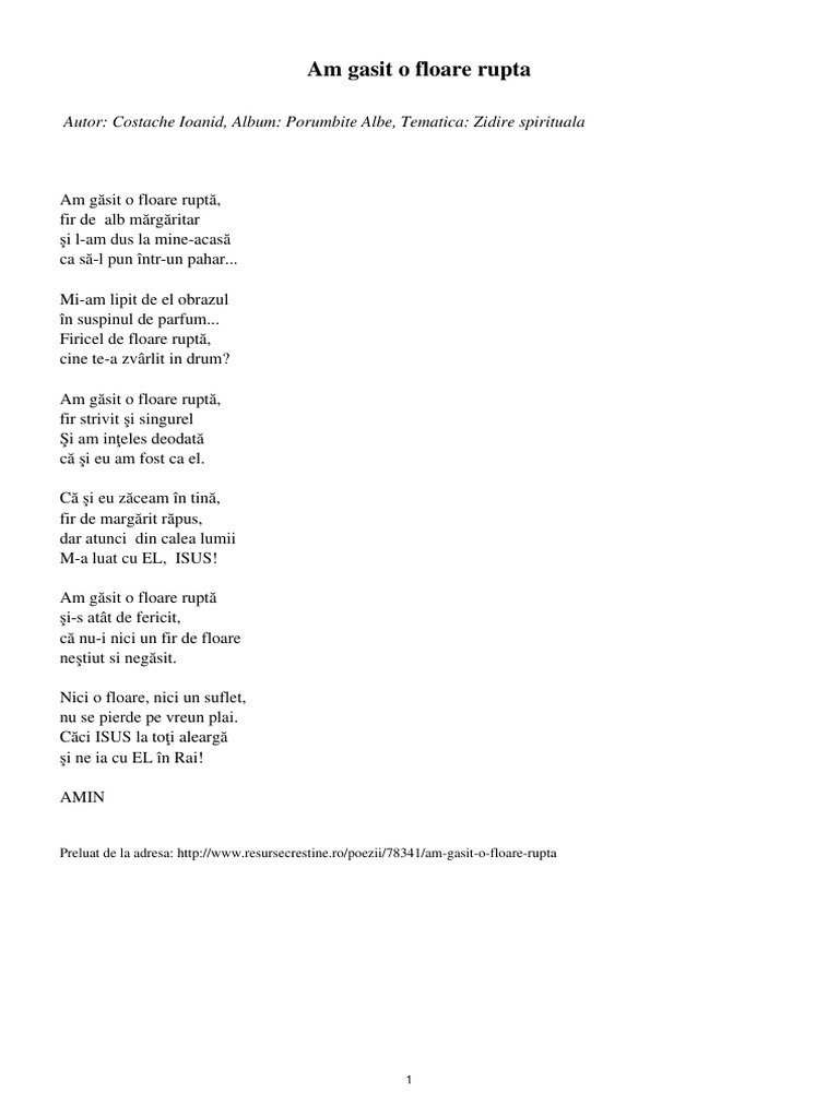 Am Gasit O Floare Rupta Deiu Saracuti Text Costache Ioanid