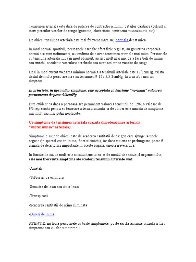 Cu toate acestea daca tensiunea este prea mica poate sa afecteze circulatia sangelui din intregul organism si sa creeze ameteli si instabilitate in corp. Mentionez ca am fost la cardiolog si mi a zis ca functioneaza bine. Desi tensiunea arteriala este variabila de la individ la individ o valoare mai mica sau egala cu 90 60 mm hg este considerata hipotensiune arteriala. Varsta scaderile in ceea ce priveste tensiunea arteriala in timp ce stai in picioare sau dupa ce ai mancat apar in principal la adultii cu varsta peste 65 de ani.